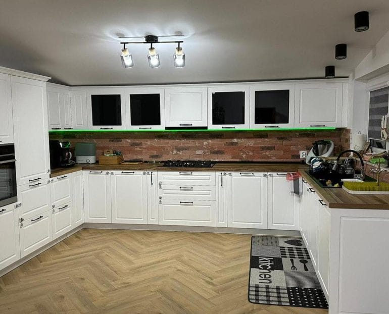 Da. Realizăm bucătării pe colț, în formă de L, U sau linie dreaptă, adaptate la configurația casei tale. Totul este personalizat, pentru funcționalitate maximă.